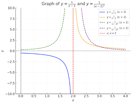 - 極を含まない区間では、関数は無限回微分可能だが、極の近傍では導関数も無限大に発散する。