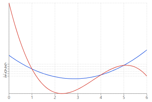 Section titled “計算例(2)”- (1, 2), (4, -3), (5, 5)の3点について補間した曲線を青色