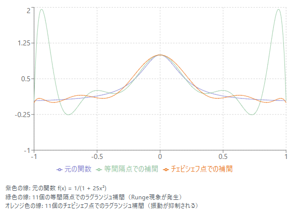 - 等間隔点の代わりに、区間の端部で密になるように分布させたチェビシェフ点を使用すると端部での振動を抑制できる